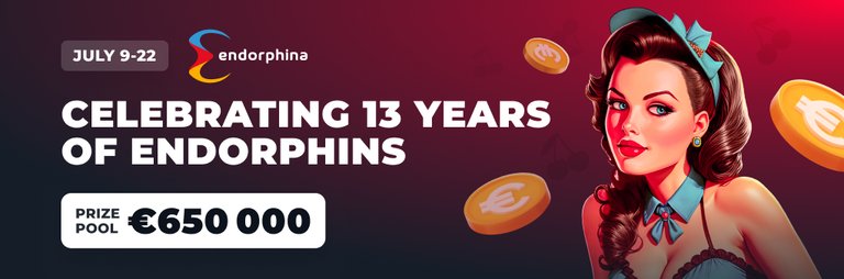 There’s no end to the joyful events! Join the party in honor of the 13th Anniversary of the Endorphina games. Play 13 days in a row until July 22 and share the €50,000 DAILY prize pool!