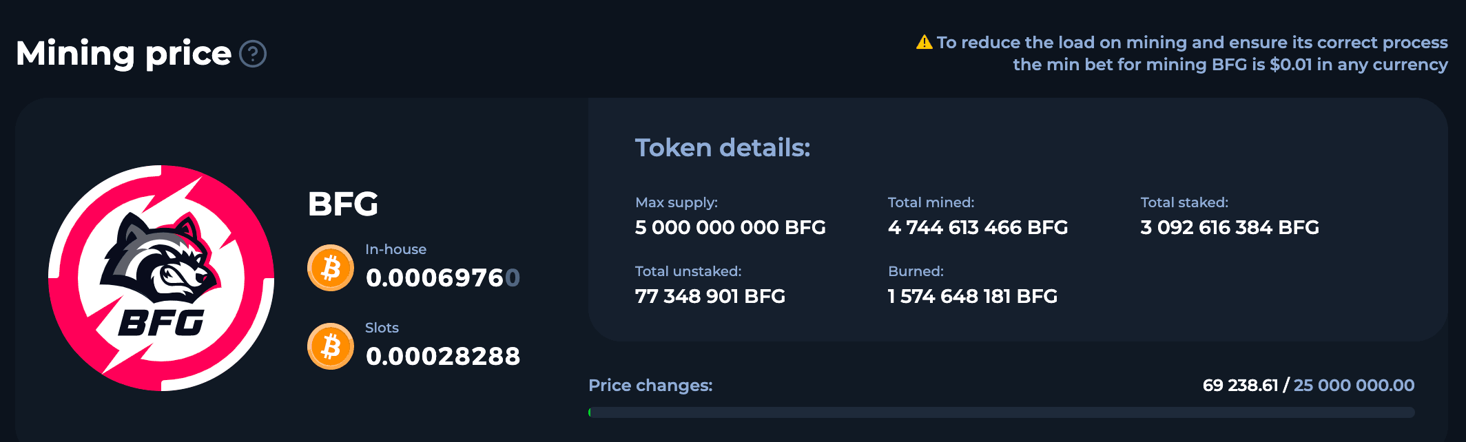 ⚠️ Para reduzir a carga de mineração e garantir seu processo correto, a aposta mínima para minerar BFG é de US$ 0,01 em qualquer moeda.