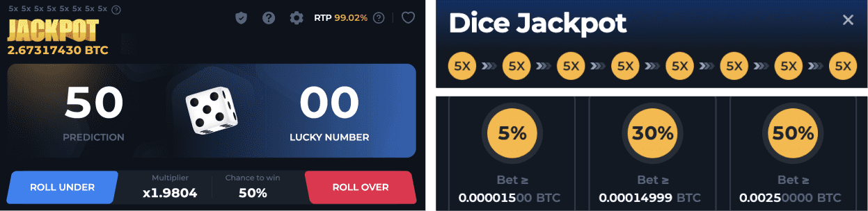 Além dos jackpots como ganhos no jogo, a BetFury tem jackpots exclusivos de Bitcoin nos jogos originais. Por exemplo, colete uma combinação de números 5X oito vezes (50, 57, 52...) no Dice. No Plinko, forme a palavra “PLINKO” eliminando alternadamente os multiplicadores correspondentes. A recompensa depende do tamanho das suas apostas e do prêmio total. Alguns usuários já conseguiram ganhar mais de 2 BTC! Veja abaixo a mecânica do jackpot original do Dice e a distribuição do prêmio: