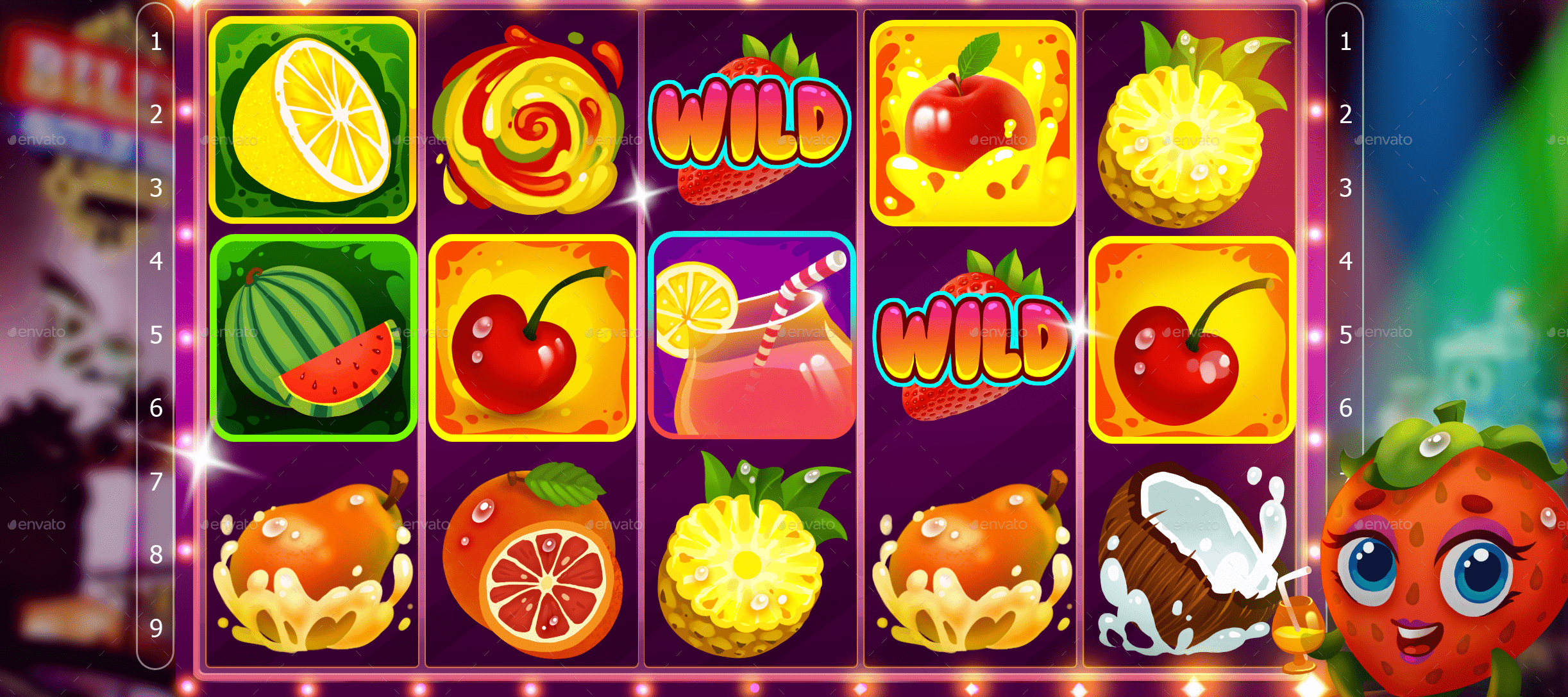 Basicamente, você pode ver limões, cerejas, melancias, bananas, morangos, laranjas e ameixas nos rolos das slots, porque são saborosas, suculentas e agradáveis de se ver. Imagine como você gira a slot e extrai todo o suco delas, como se estivesse espremendo os ganhos desejados.