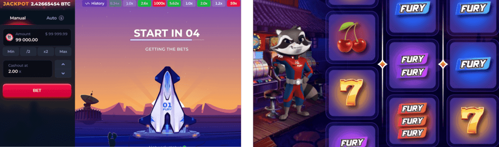 Em primeiro lugar, é importante ter uma compreensão sólida do conteúdo do jogo, incluindo o tema e o estilo. Isso requer uma análise profunda do público-alvo e dos desejos dos usuários. Personagens populares de filmes, animes, personagens únicos, coisas reconhecíveis e referências - é disso que você precisa! Por exemplo, vamos pegar o caça-níquel Fury Wild In-house. Neste jogo, ao lado dos rolos do caça-níquel, Fury é retratado contra o fundo de brilhantes caça-níqueis. Na última atualização do Crash, podemos ver um foguete “01 FURY”, atrás do qual há uma paisagem atmosférica de cânion com uma referência a centros secretos como a Área 51.
