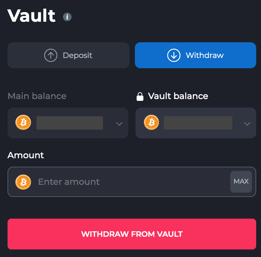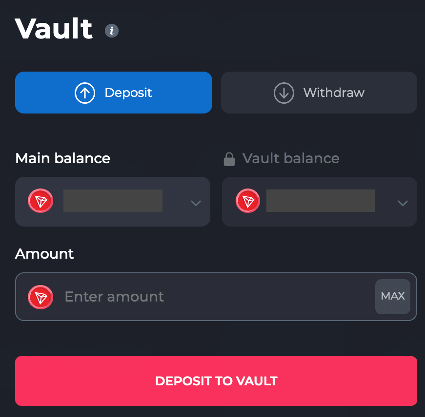 A função Depósito permite que você transfira seus fundos do saldo do jogo para o Vault. Não há restrições quanto ao valor da criptomoeda que você deposita.